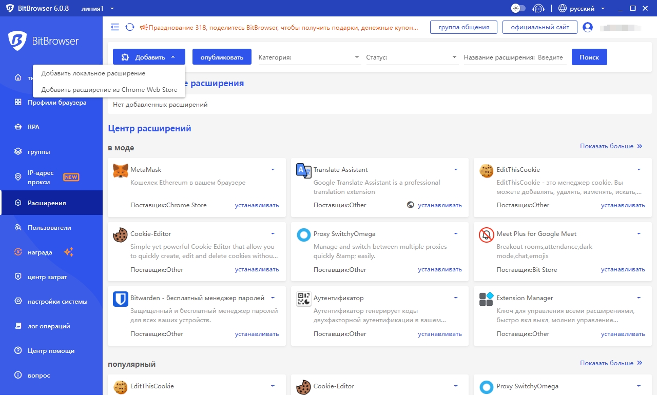 К сожалению, у GoLogin в настоящее время нет рынка расширения внутри приложения. Это означает, что пользователи не могут просматривать и загружать другие функции или возможности непосредственно в приложении GoLogin. Однако с помощью BitBrowser вы можете выбирать из богатой библиотеки плагинов, чтобы оптимизировать рабочий процесс и максимально повысить эффективность работы.
