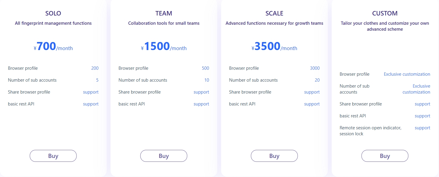 Первый платный план, предоставляемый VMLogin, называется «Solo», он включает в себя 200 оконных профилей и 5 субаккаунтов, а также поддерживает совместное использование профилей браузера и функций API. Ежемесячная плата за такую конфигурацию составляет 99 долларов США, а также платный план «TEAM», 500 профилей примерно за 210 долларов США и финальный платный план «SCALE», который предоставляет 3000 профилей и требует 500 долларов США, а также дополнительные субаккаунты. . Мы видим, что в этом случае за ненужные дополнительные профили будет взиматься плата, а мелкие пользователи, которым нужны только десятки профилей, будут заблокированы от программного обеспечения.